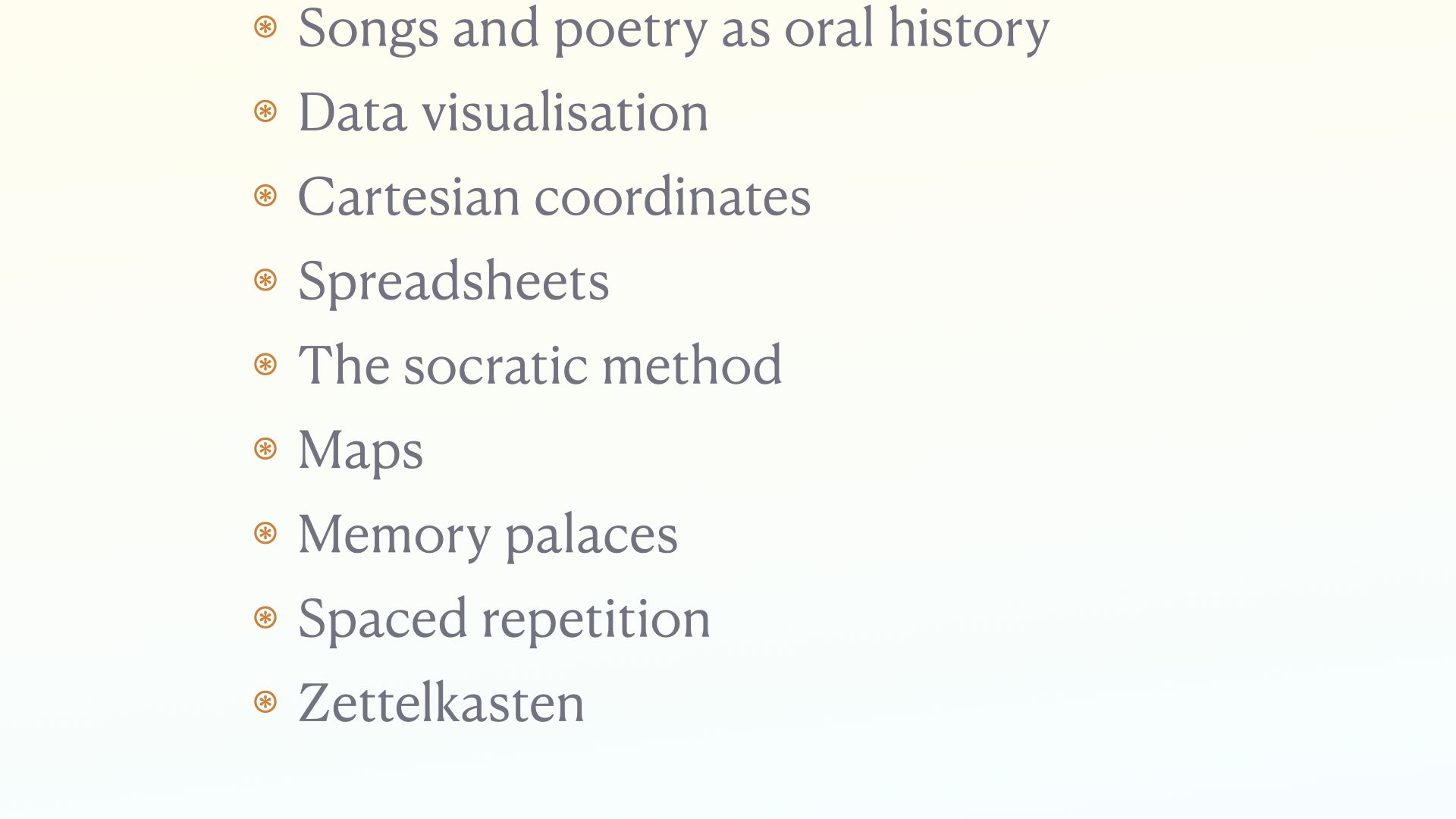 - Spatial memory. We have extremely effective memories when we relate facts to physical space. I haven’t seen that much exploration of designing tools to help people build memory palaces.