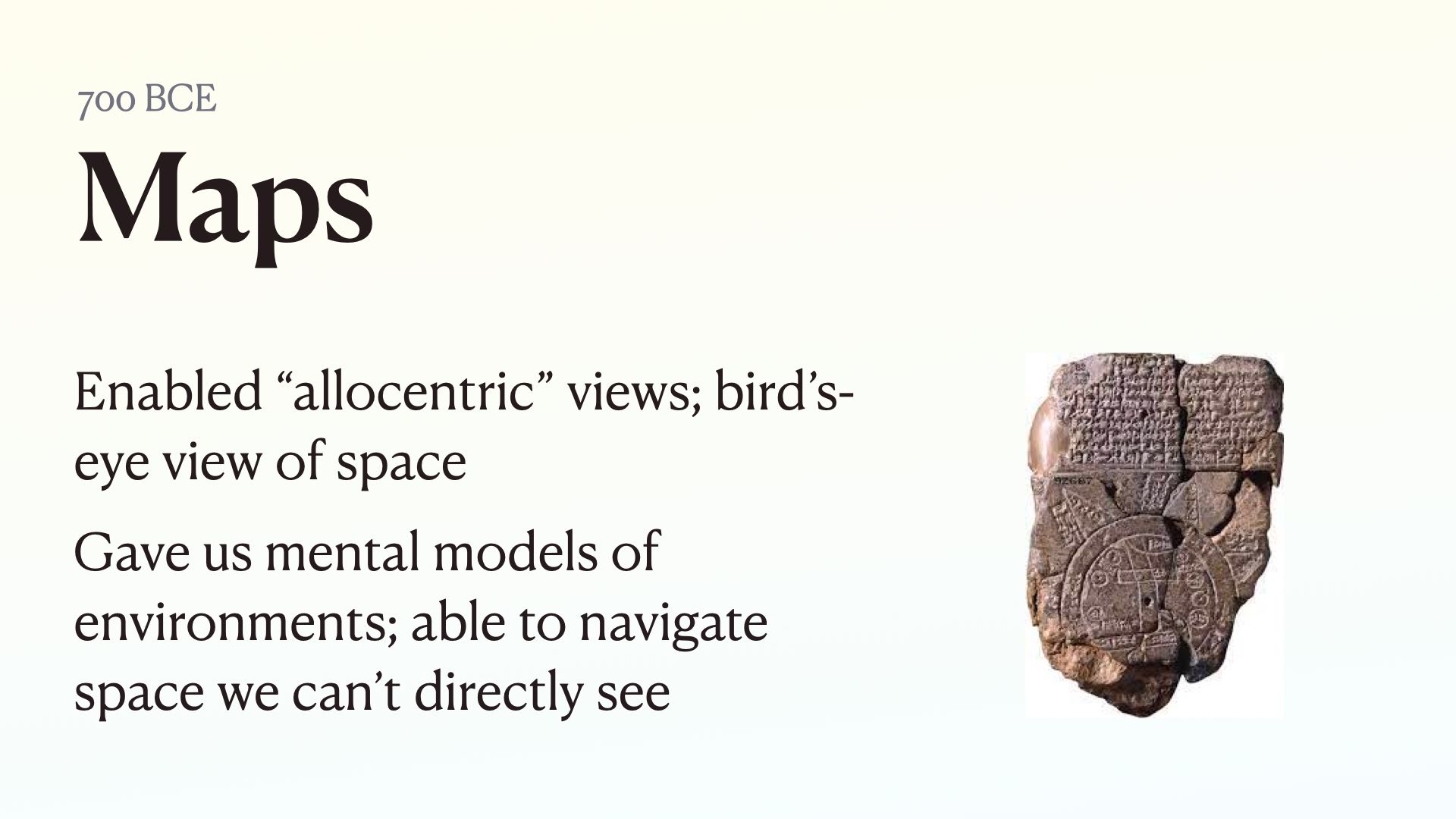 Maps enabled humans to mentally navigate space differently - gave us allocentric views vs. egocentric.