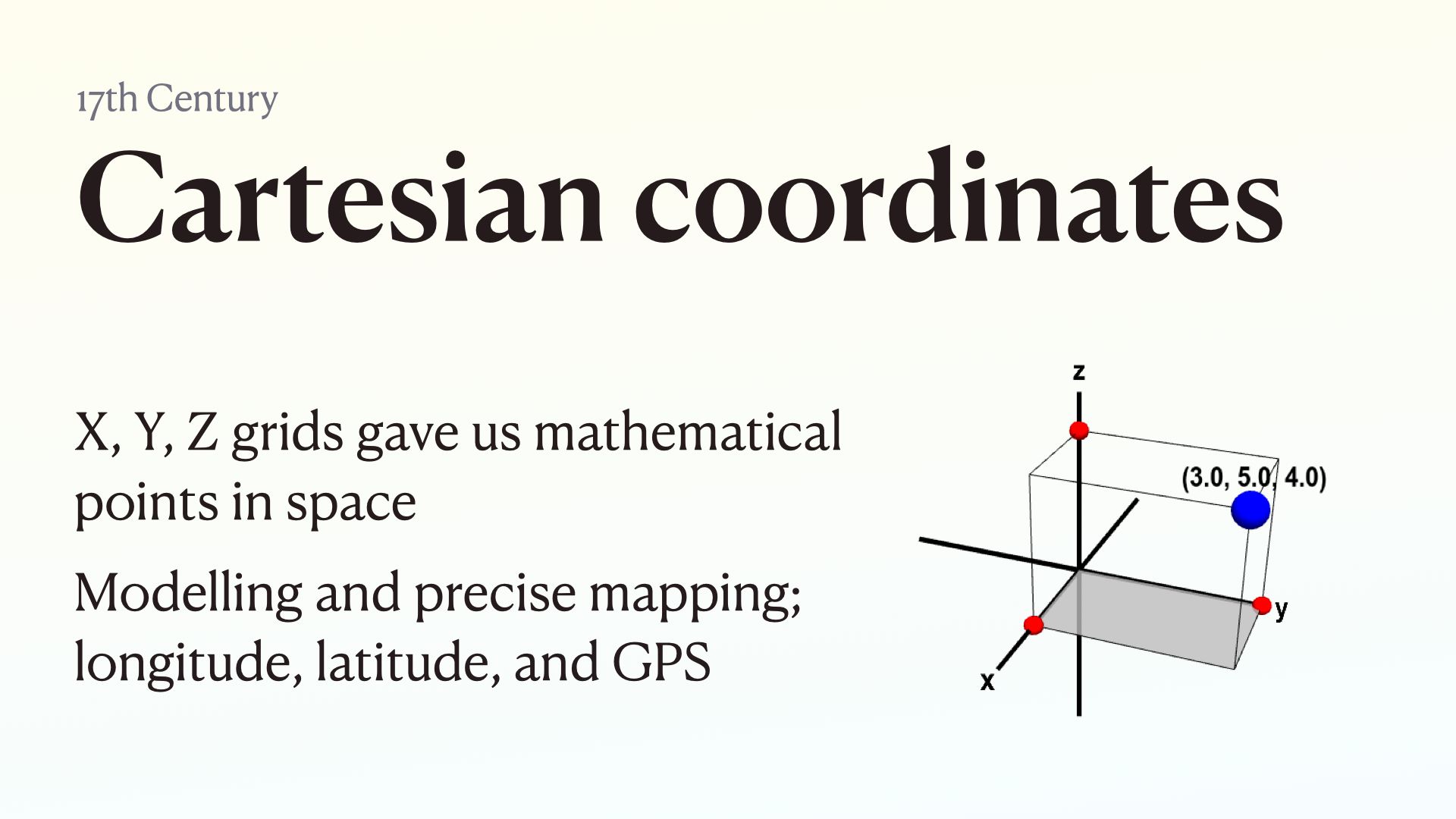 Made us able to describe points in space with specific numbers. Allows us to model objects that don’t exist with accuracy. Allows us to precisely map and refer to points on the earth. Led to GPS.