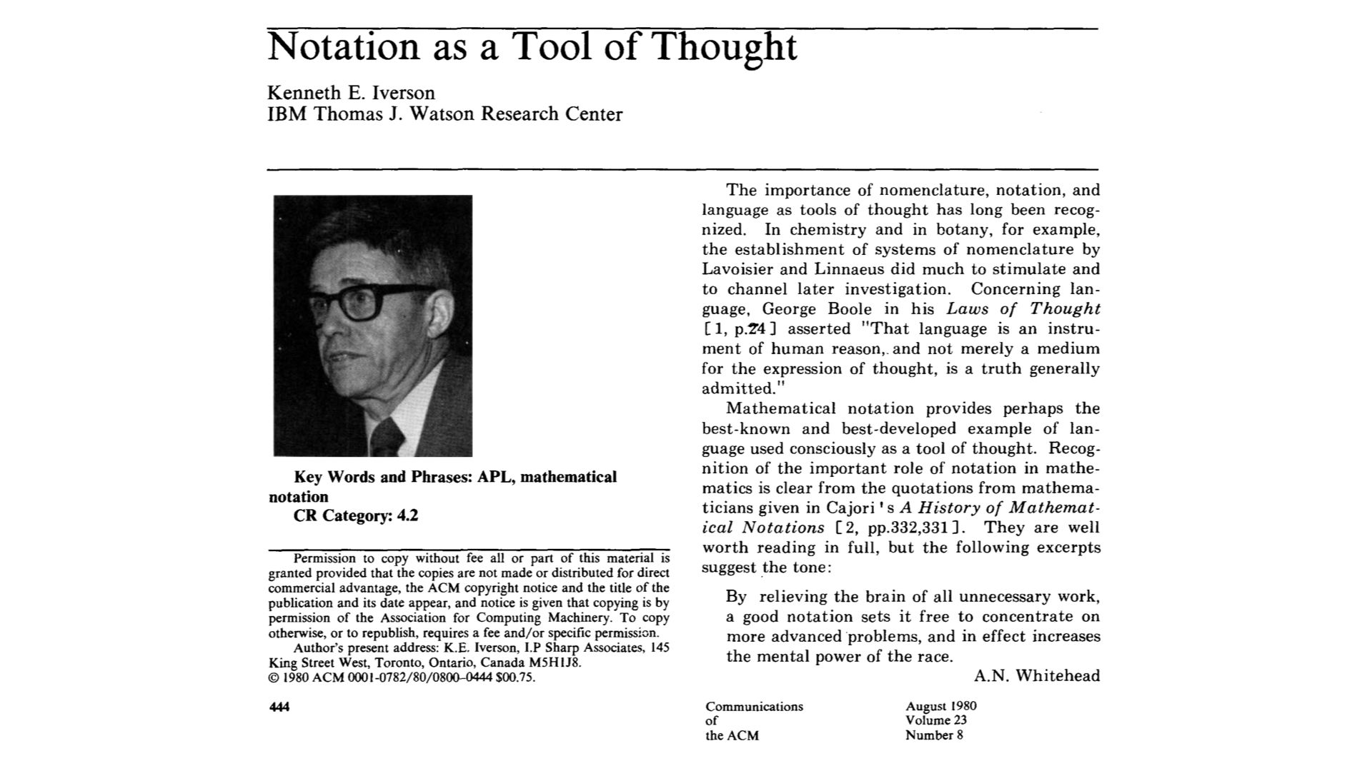 Talking about mathematical notation as the best known and best developed example of a tool for thought.