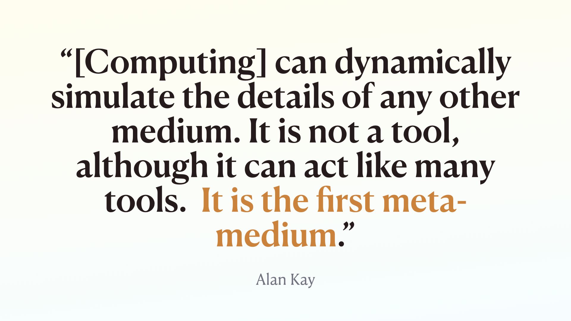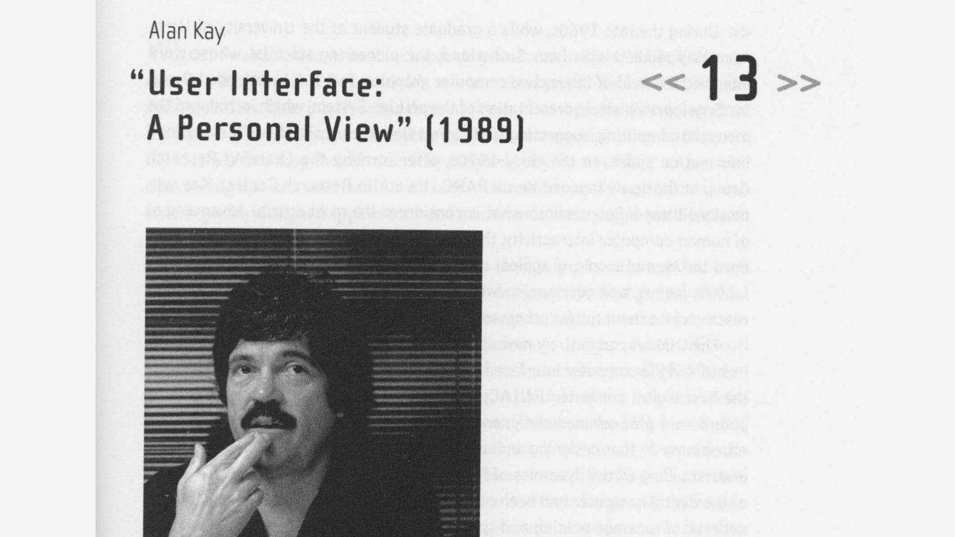Alan Kay picked up a lot of this Philosophy and applied it while developing the foundations of most of our current computing environments at Xerox PARC Wrote a paper called “User Interface: A Personal View” in 1989 where he talked about his vision of the potential of computational mediums