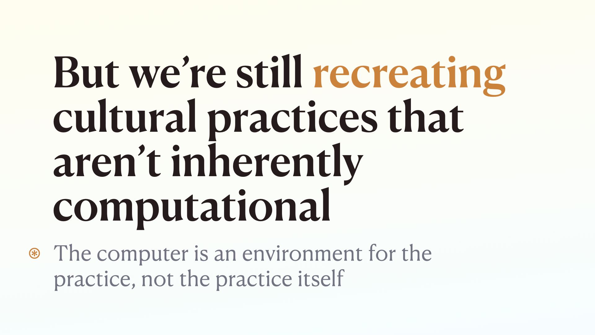 But even though computing expands some of the practices in new ways, we shouldn’t forget we’re still recreating cultural practices that first exist outside computing.