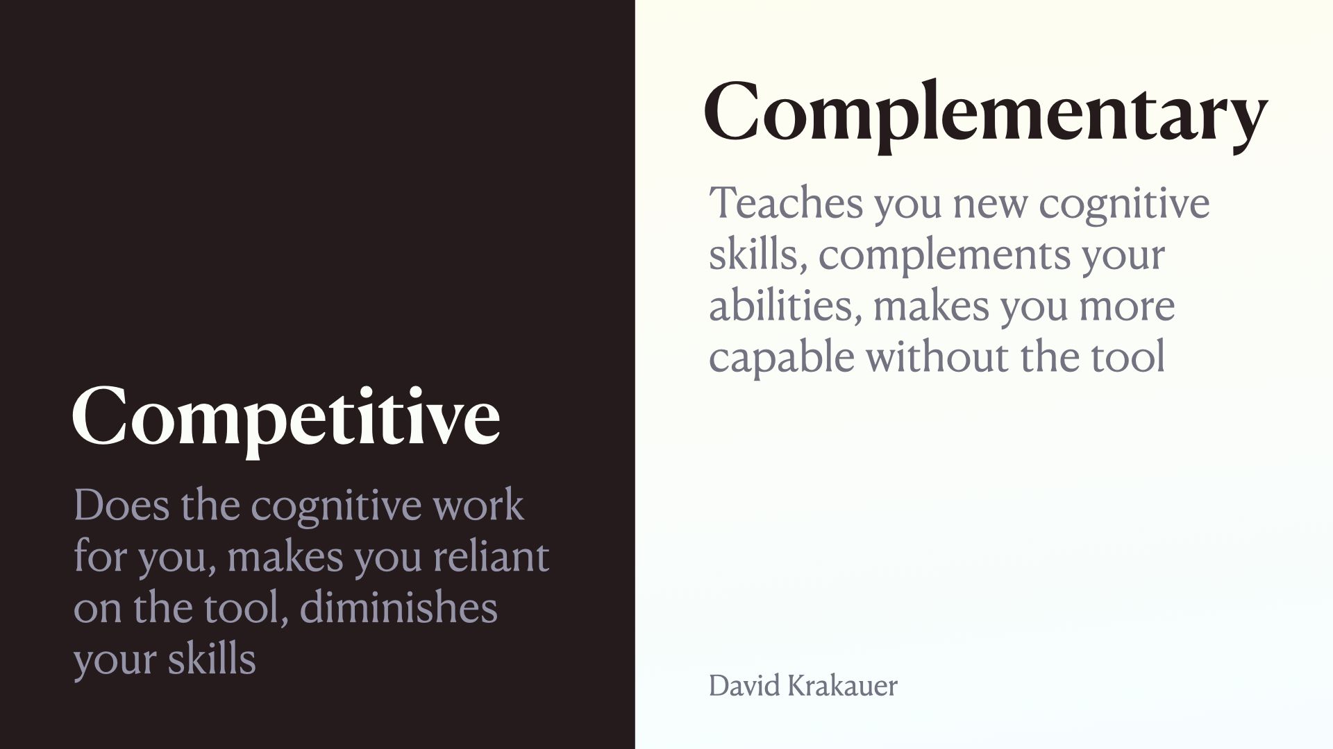 Competitive artefacts do the cognitive work for you and hide their workings. So when you take the tool away, you’ve actually diminished your skills because you haven’t been practicing it. They compete with us in a way.