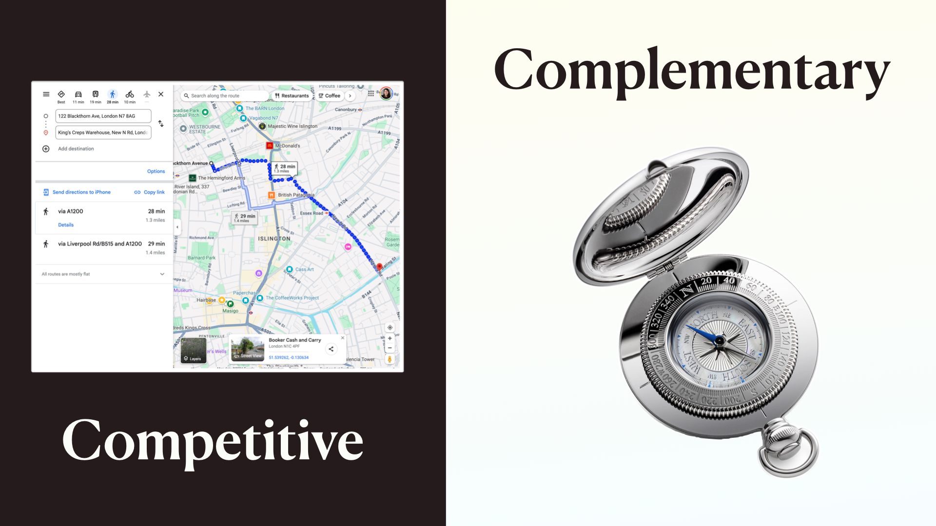 A good example of this is Google Maps versus a compass