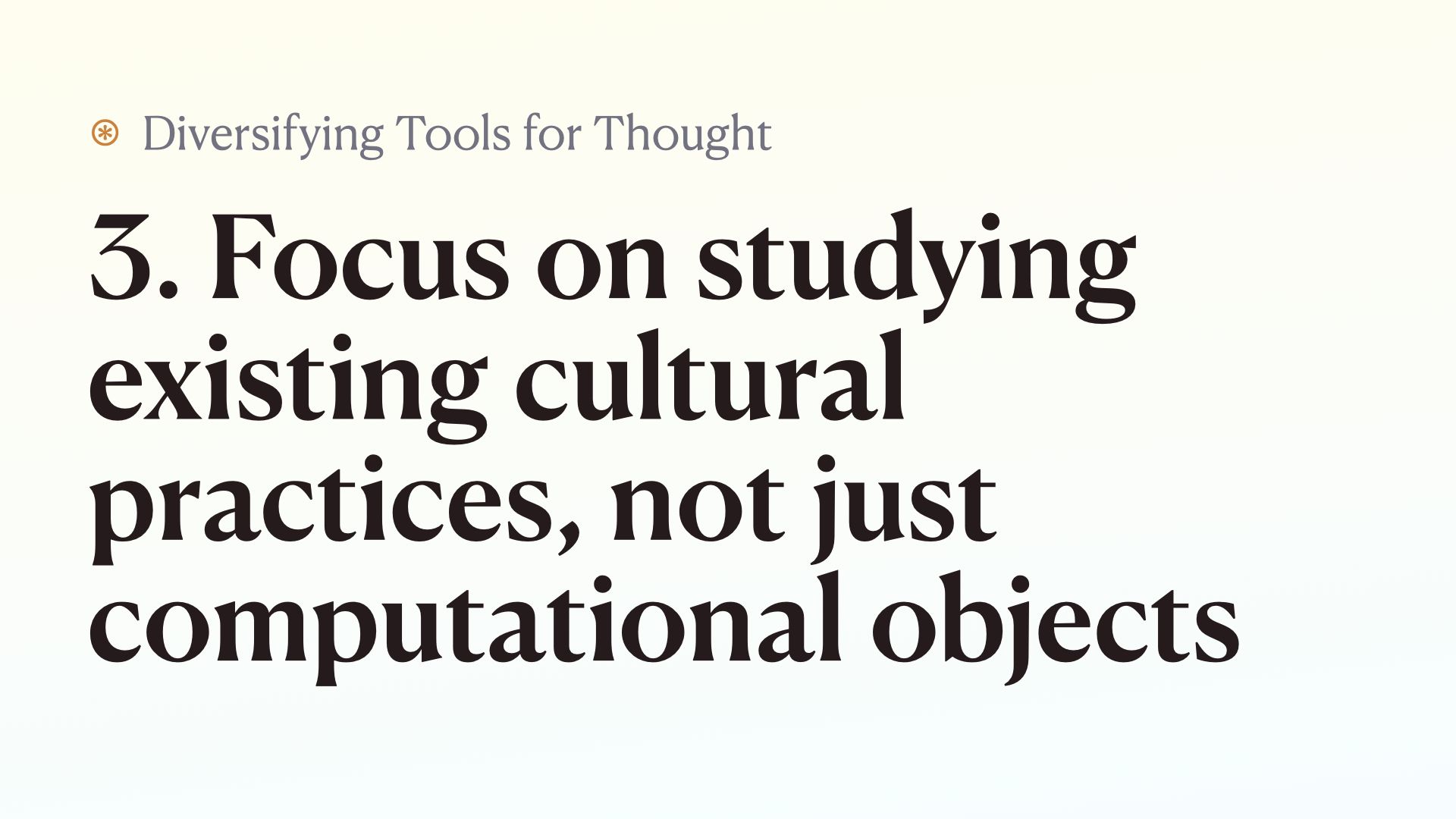 Specifically, theories like embodied cognition, extended mind theory, and looking at examples of cross-cultural ways of thinking from ethnographic research could add a lot to our conception of tools for thought.