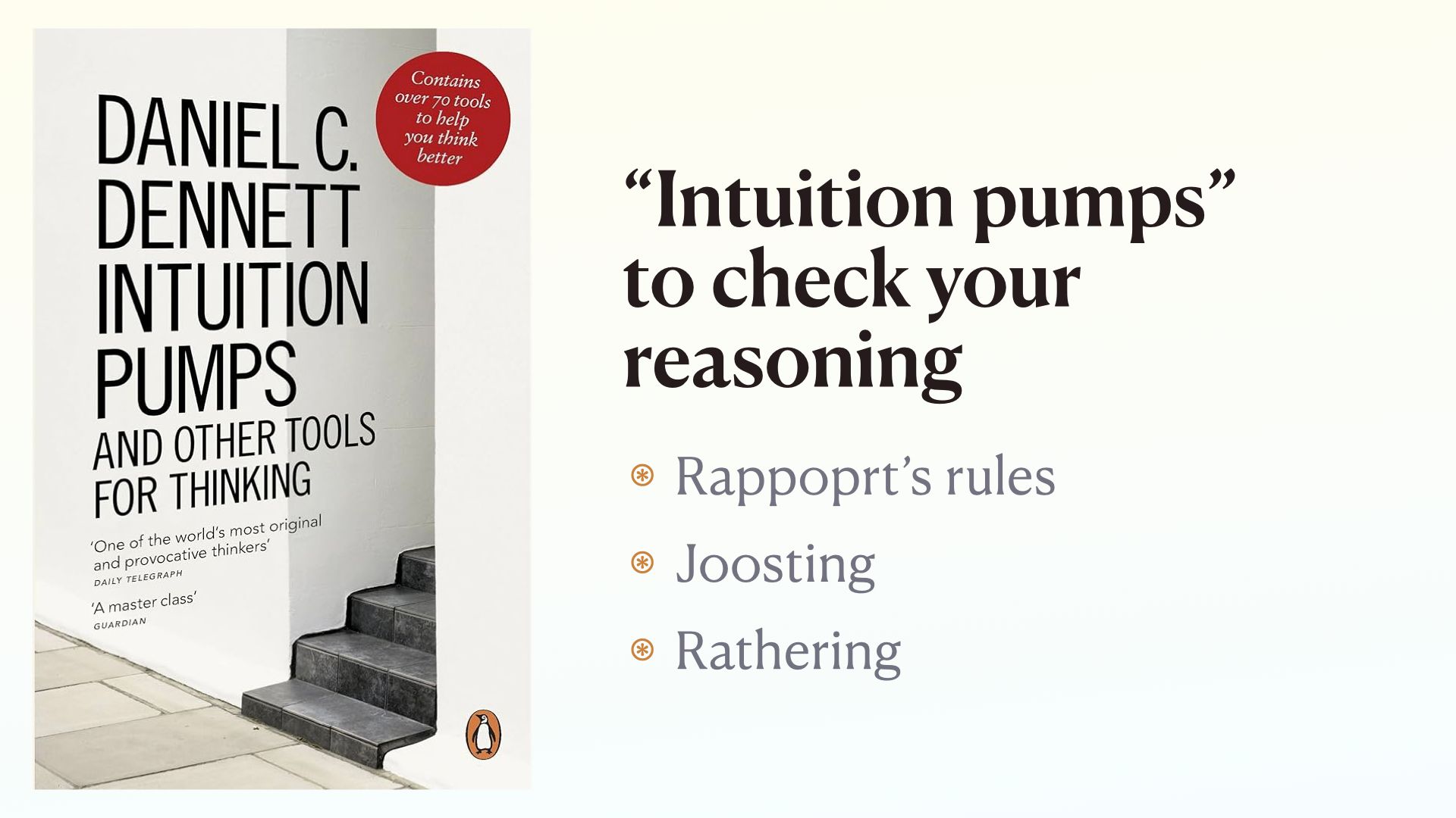The way he thinks about TFT is similar to what I proposed at the beginning; cites words, numbers, maps, diagrams. But, being he philosopher, he is especially interested in “intuition pumps” which is his own term meaning reasoning moves that help you think critically about philosophical problems. These include following Rapport’s rules, Joosting, and Rathering. If you want to know what those are, you’ll have to read the book.